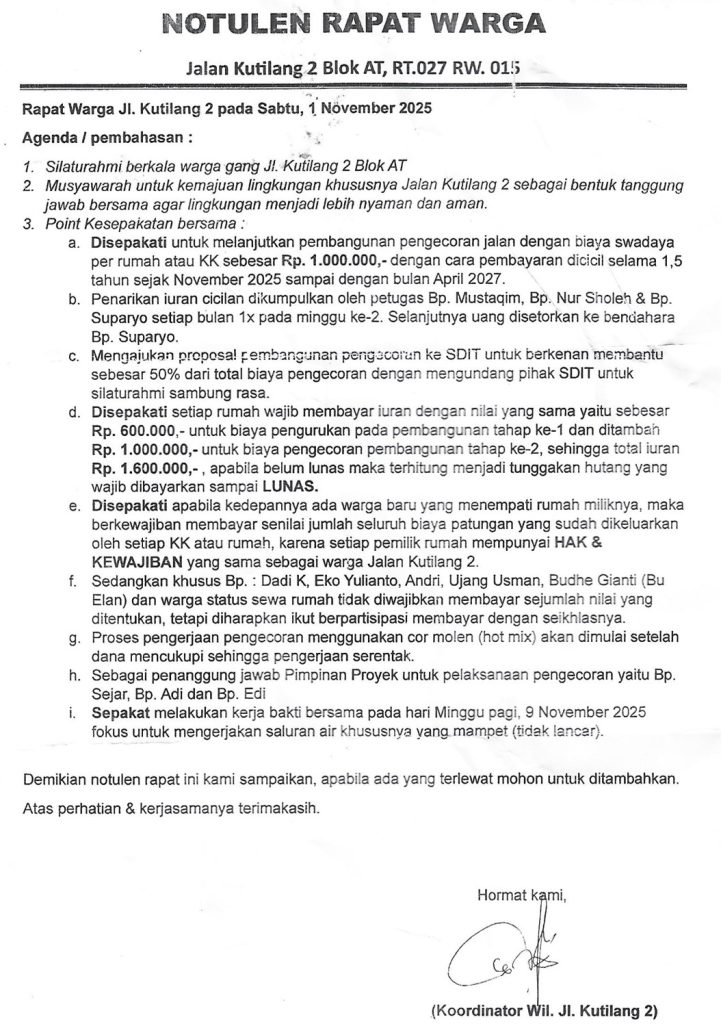 Sehubungan dengan hasil Silaturahim Warga Kutilang 2 pada Sabtu, 01 November 2025 ,yang menghasilkan beberapa poin untuk kemajuan lingkungan bersama khususnya adalah kebutuhan Pengecoran Jalan Kutilang 2, yang mana Notulennya sebagai berikut: