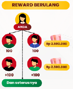 Setiap terjadi 100 titik kiri - 100 titik kanan, dan berlaku kelipatan dan terus berulang tanpa batas, mendapat Rp. 2.500.000 secara berulang terus menerus