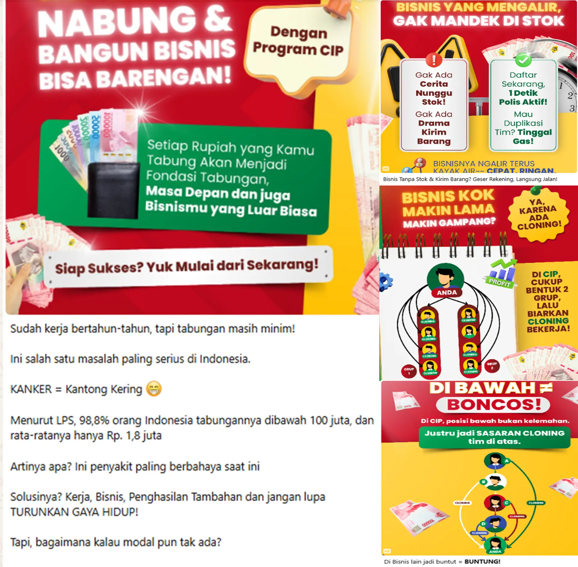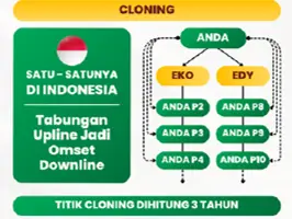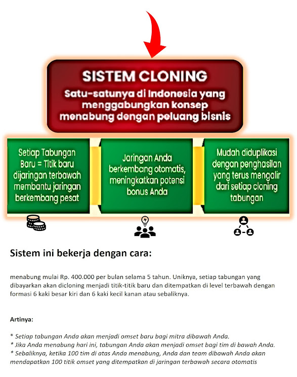 menabung Rp 400.000 per bulan selama 5 tahun. Uniknya, setiap tabungan yang dibayarkan akan di cloning menjadi titik-titik baru dan ditempatkan di level terbawah sehingga semua akan mendapatkan guyuran omset dan bonus.