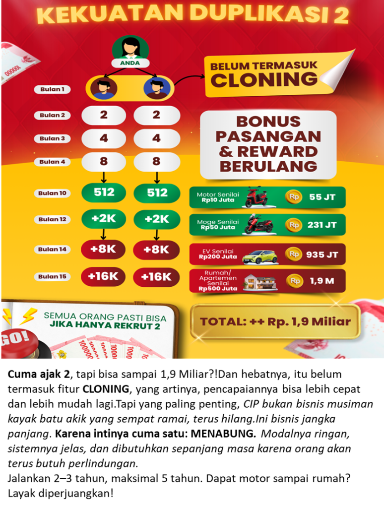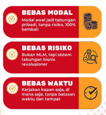 menabung Rp 400.000 per bulan selama 5 tahun. Uniknya, setiap tabungan yang dibayarkan akan di cloning menjadi titik-titik baru dan ditempatkan di level terbawah sehingga semua akan mendapatkan guyuran omset dan bonus.