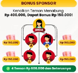 Setiap terjadi 50 titik kiri - 50 titik kanan, maka berhak mendapat Rp. 10.000 setiap ada nasabah baru, pada jalur keturunan Anda tanpa melihat kaki besar atau kecil tanpa batas kedalaman.