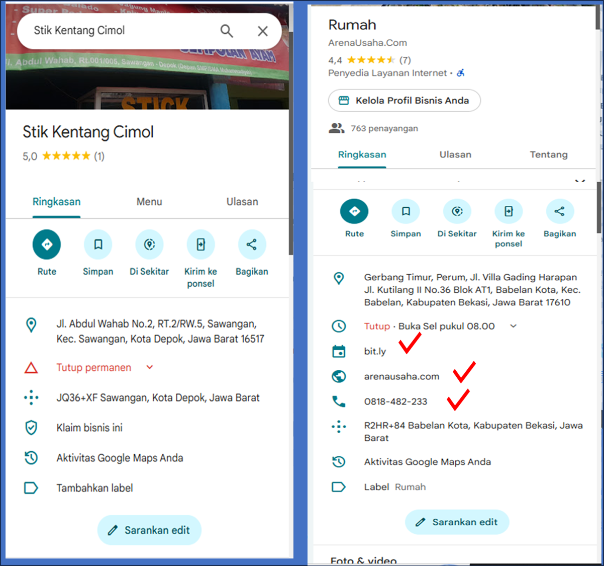 Foto pertama: Hanya ada Nama Lokasi Titik Ordinat (Tikor) di GMaps, Sayang tidak disertai dengan info detail tentang usaha atau bisnisnya. Dan itu sering kita temui.